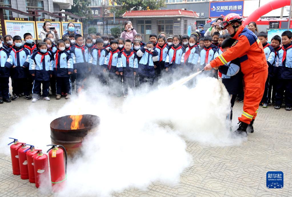 2月6日,在江蘇省連云港市墟溝小學,消防救援人員教學生正確使用消防滅火器。