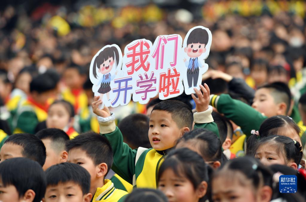 2月6日,四川省南充市蓬安縣實驗小學的學生舉著“我們開學啦”的牌子參加開學典禮。