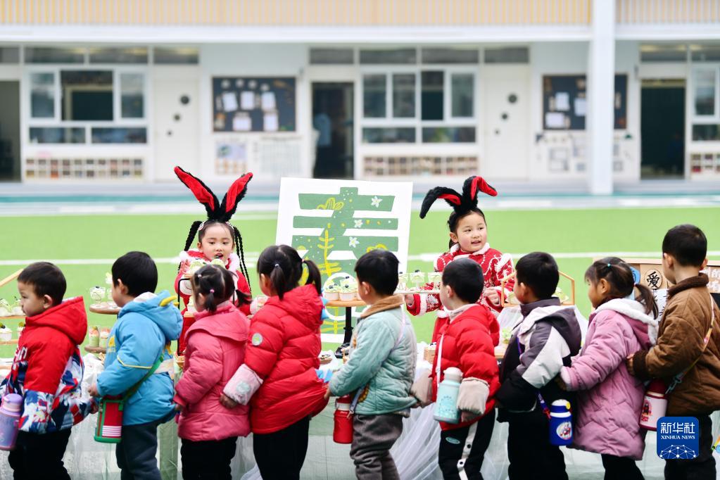 2月6日,安徽省阜陽市阜南縣育新幼兒園,孩子們在校園內向同學打招呼。
