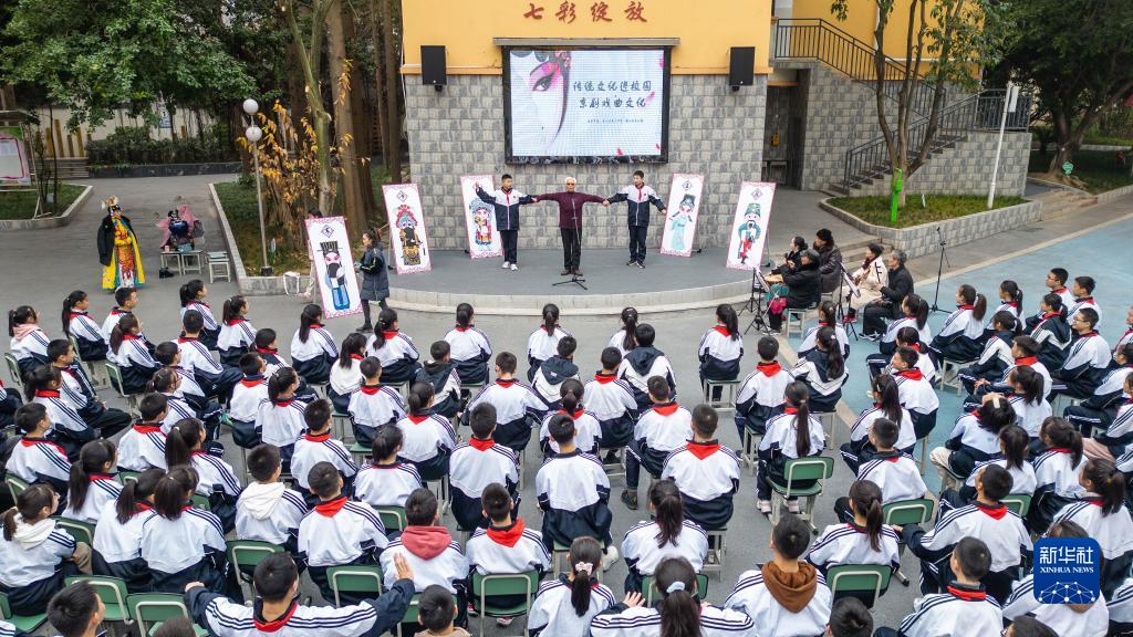 2月6日,在四川眉山彭山區第三中學舉辦的“開學第一課,非遺進校園”活動上,學生學習京劇動作(無人機照片)。