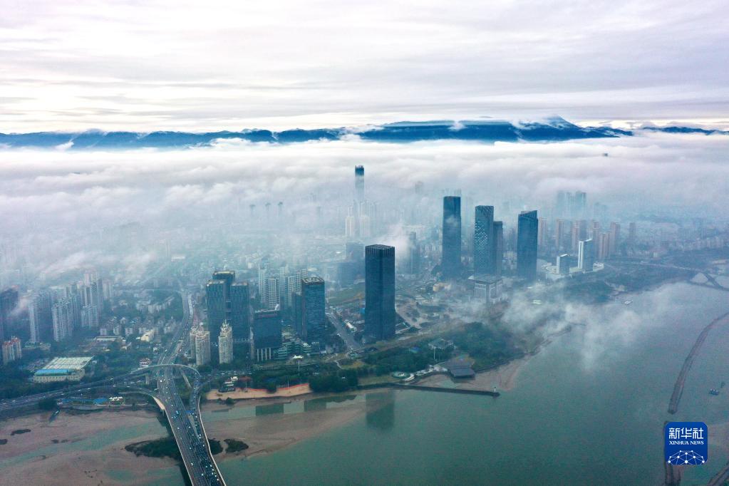 這是平流霧中的福州城市建筑群(2月6日攝,無人機照片)。
