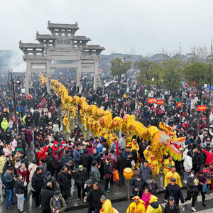 當日,安徽省全椒縣傳統民俗活動正月十六“走太平”拉開帷幕,巡游隊伍穿過太平橋,獻上精彩紛呈的民俗表演。