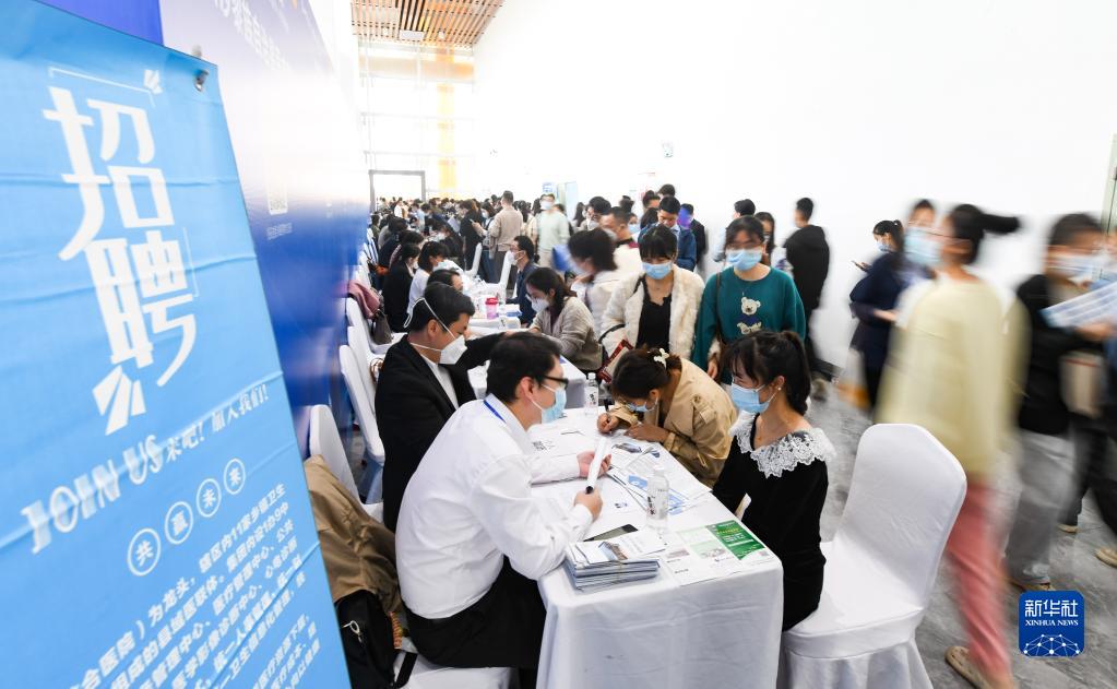 2月6日,求職者在用人單位招聘展臺前咨詢。