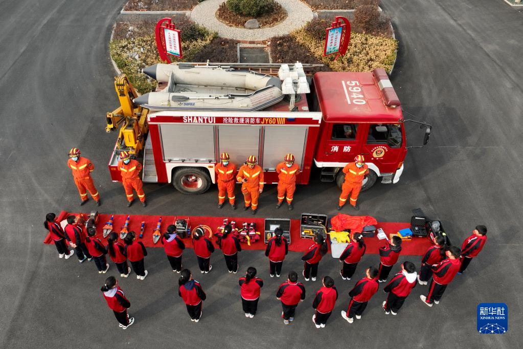 2月6日,在隆堯縣第二實驗小學,消防員向學生介紹消防救援設備(無人機照片)。