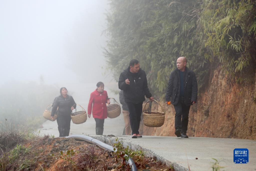 在福斗村大森林碩豐農業高山水果基地,返鄉創業種植高山水果的村民陳繩春(右一)帶領工人采收沃柑(2月5日攝)。
