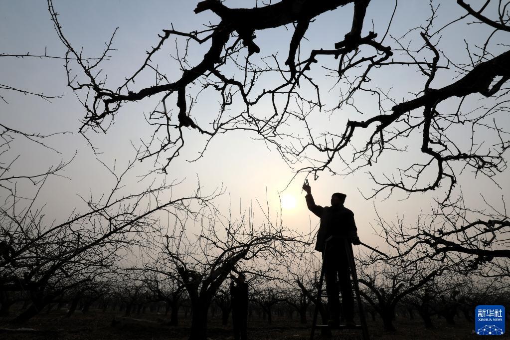 2月6日,石家莊市趙縣精園梨果專業合作社果農在梨園給梨樹修剪枝條。