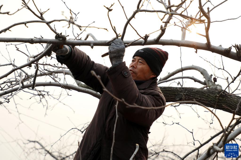 2月6日,石家莊市趙縣精園梨果專業合作社果農在梨園給梨樹修剪枝條。