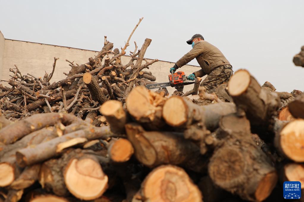2月6日,在石家莊市趙縣范莊鎮秀才營村一家再生資源回收公司,工作人員在切割回收的梨樹枝。