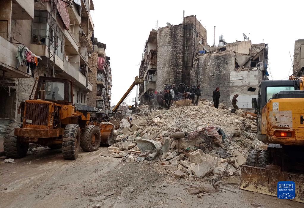 2月6日,人們在敘利亞阿勒頗省一處倒塌的建筑現場進行救援。