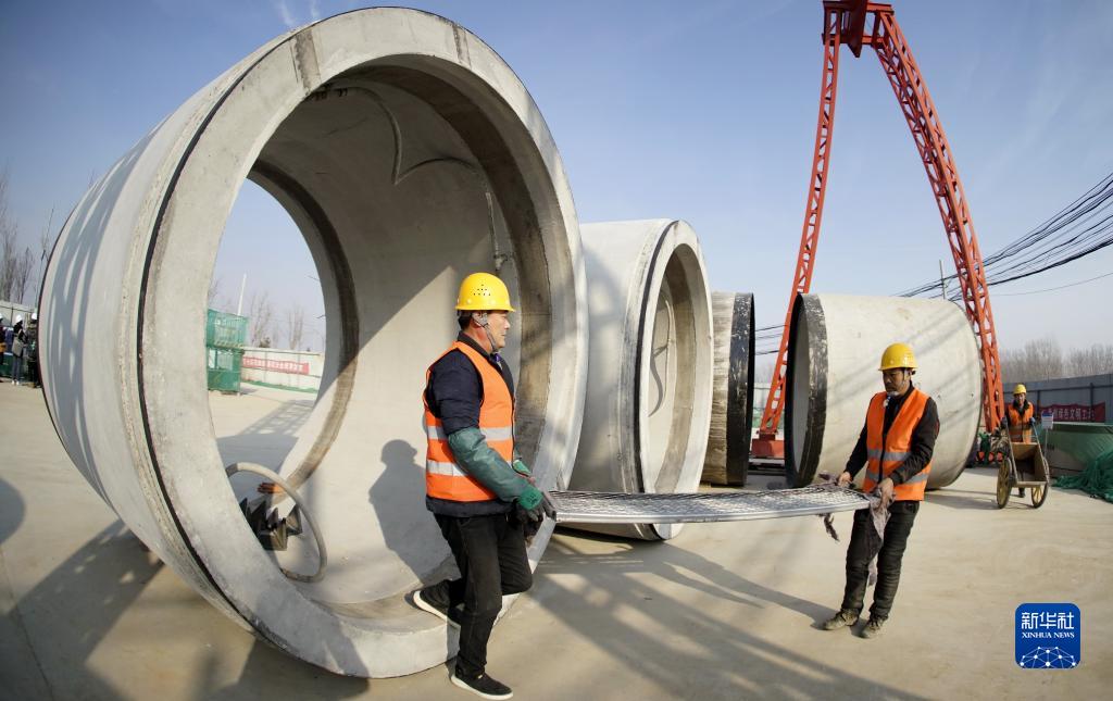 2月6日,工人在南水北調配套工程北京大興支線機場連接線工地搬運建筑材料。