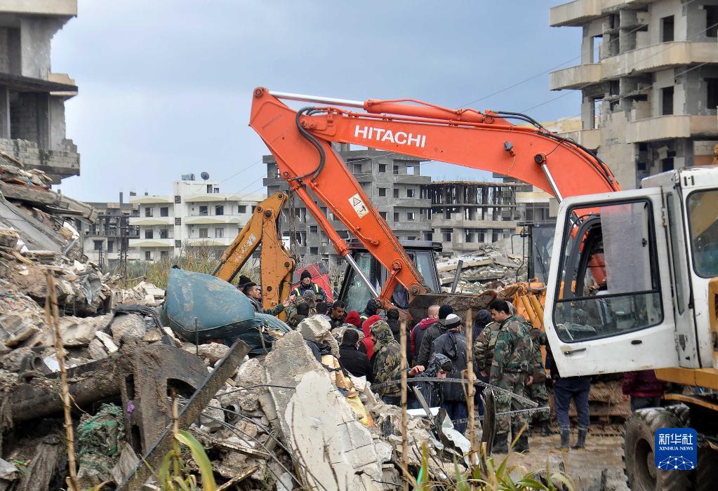 2月6日,在敘利亞拉塔基亞省杰卜萊,人們在一處倒塌的建筑現場進行救援。