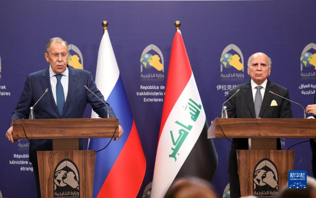 2月6日,在伊拉克首都巴格達,伊拉克外長侯賽因(右)與到訪的俄羅斯外長拉夫羅夫出席聯合新聞發布會。
