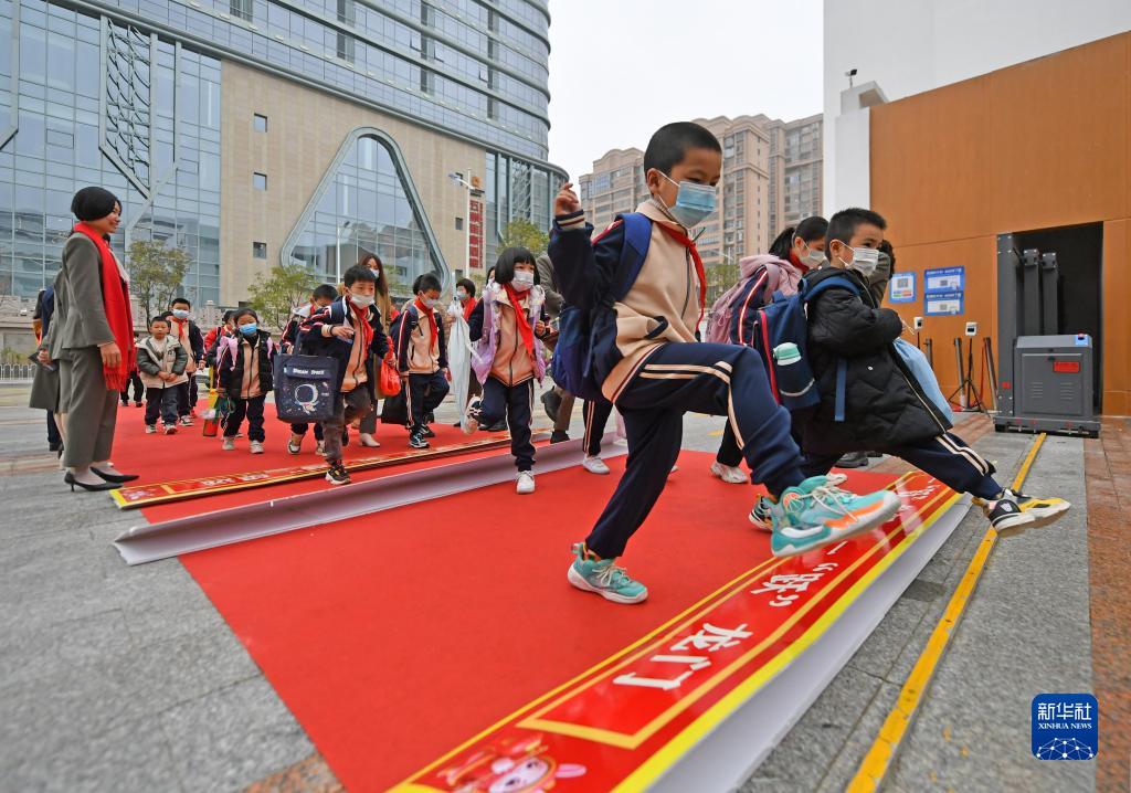 2月7日,在福建師范大學泉港實驗小學,孩子們在跨越“龍門”,開啟新學期。