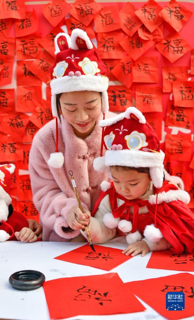 2月7日,在浙江省臺州市仙居縣中心幼兒園西門街分園,孩子們在老師幫助下寫“?!弊?。