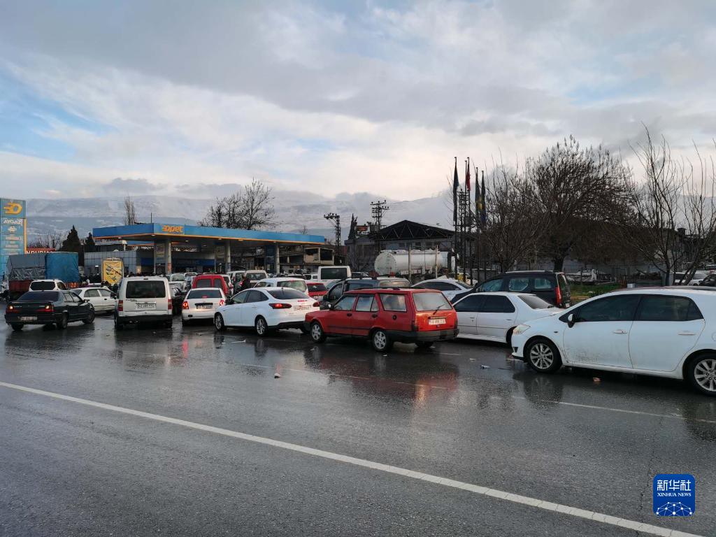 2月7日,人們在土耳其卡赫拉曼馬拉什排隊加油。目前卡赫拉曼馬拉什大部分加油站都已關閉(手機照片)。
