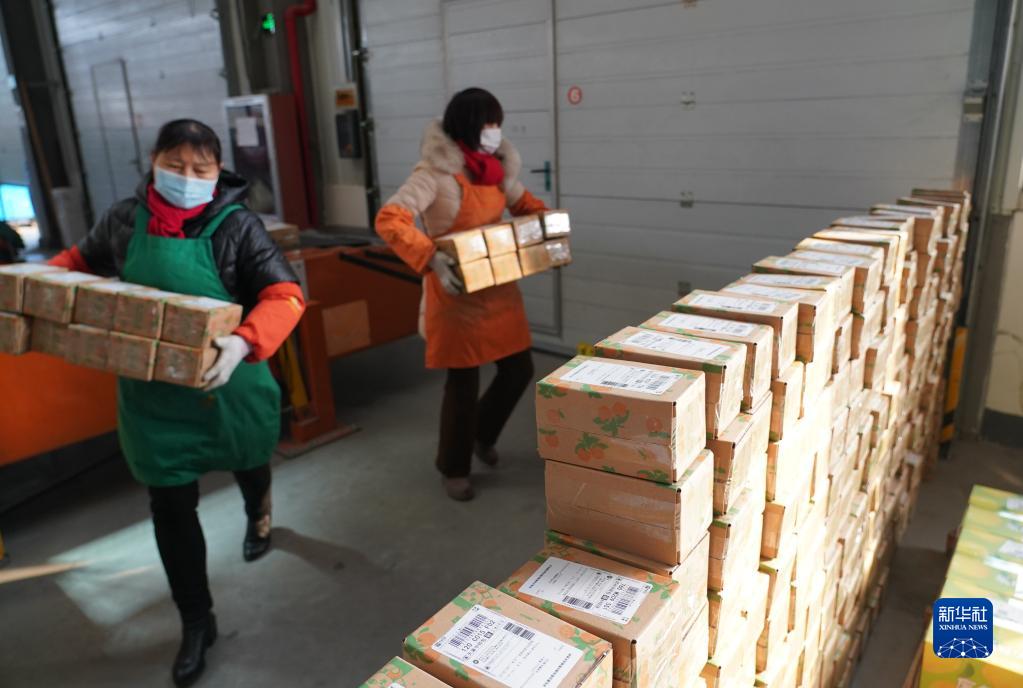2月6日,在位于武功縣的陜西美農網絡科技有限公司物流倉,工作人員在堆放快遞包裹。