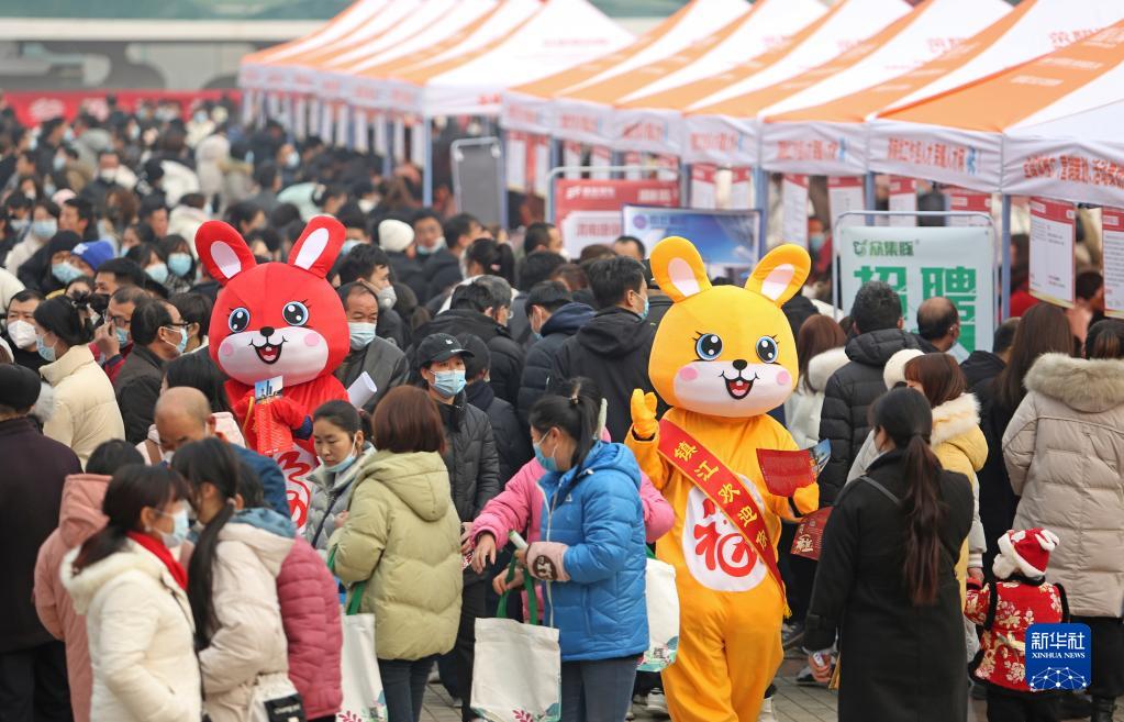 2月7日,陜西省渭南市臨渭區中心廣場招聘會現場,身著兔子服飾的工作人員在人群中發放招聘信息。