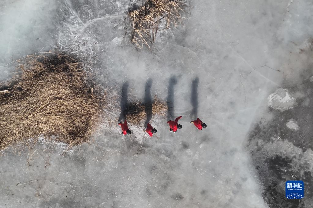 2月6日,中國石油遼河油田興隆臺輸氣分公司巡線工人在進行巡線工作(無人機照片)。