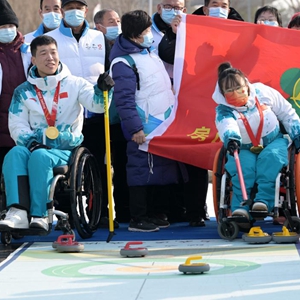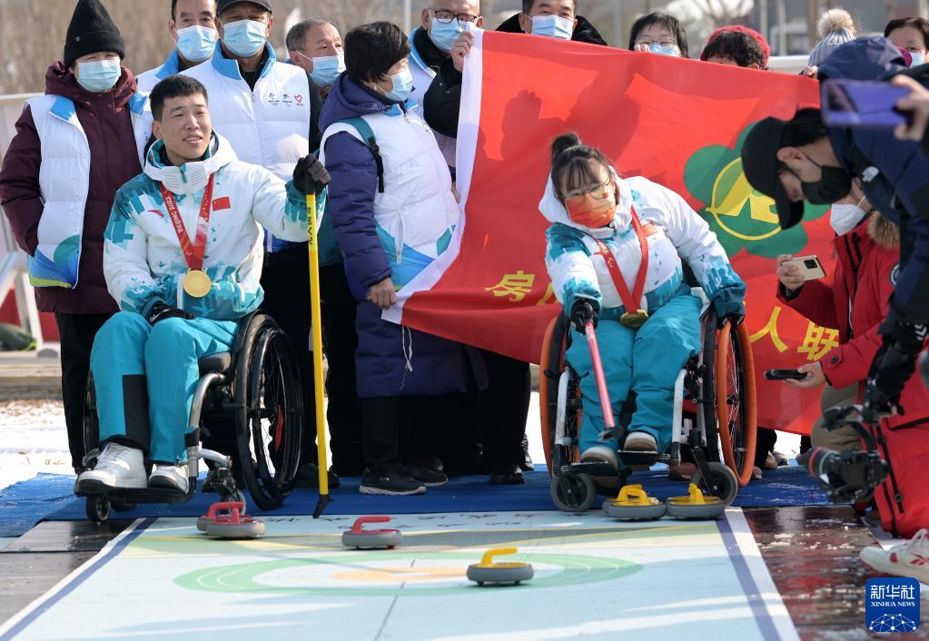 2月7日,北京冬殘奧會冠軍、中國輪椅冰壺隊隊員陳建新(前左)和隊友閆卓在活動上與殘疾人朋友一同體驗旱地冰壺項目。