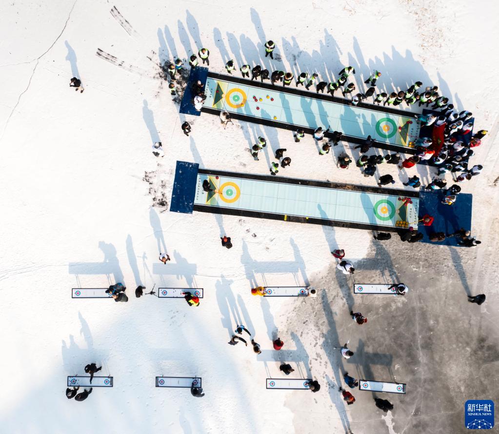 這是2月7日拍攝的旱地冰壺和迷你冰壺的活動現場(無人機照片)。