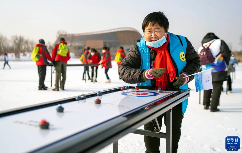 2月7日,人們在活動現場體驗迷你冰壺項目。