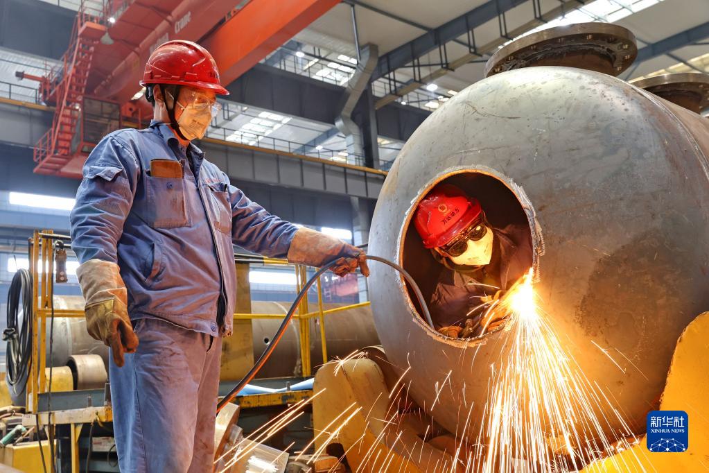 2月6日,江蘇南通萬達能源動力科技有限公司的工人在生產車間趕制出口節能環保鍋爐訂單產品。