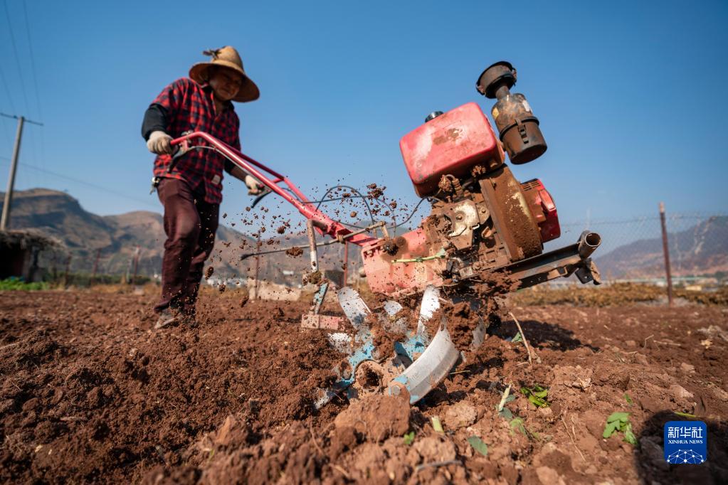 2月7日,在云南省大理白族自治州南澗彝族自治縣楊免莊村,農民在耕地。