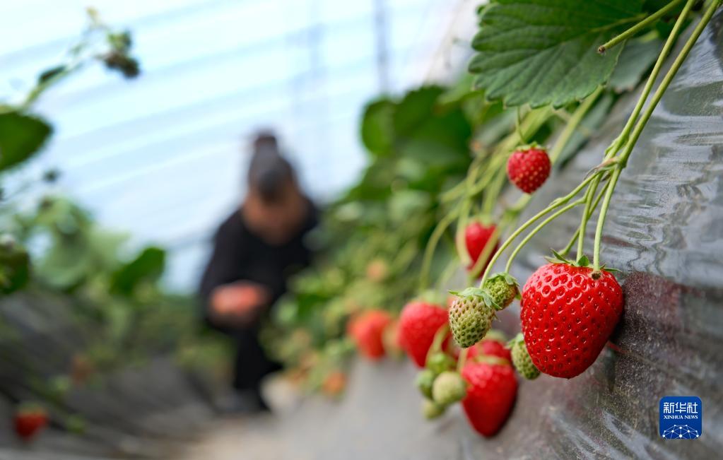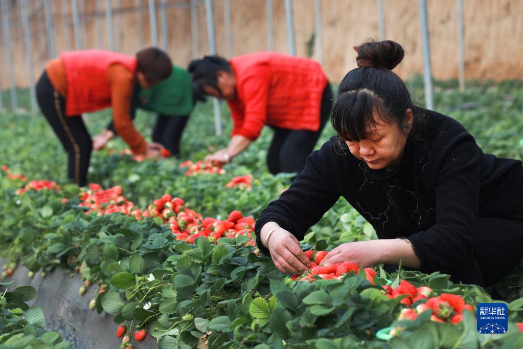 2月7日,農戶在陜西省渭南市合陽縣路井鎮一家庭農場采摘草莓。