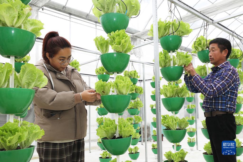 2月7日,在浙江省義烏市一蔬菜產業園,菜農查看無土栽培葉菜長勢。