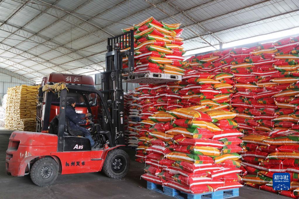 2月7日,在甘肅省定西市安定區一農資配送中心,工人操作叉車搬運農資。