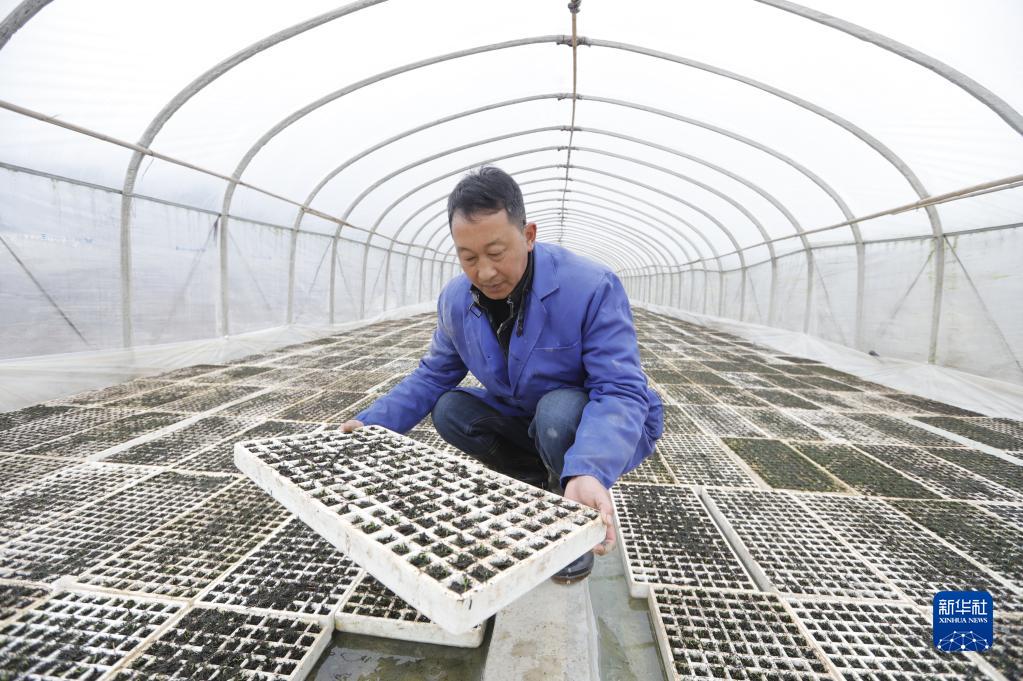 2月7日,在貴州省黔南布依族苗族自治州福泉市鳳山鎮竹王城村辣椒育苗基地,村民查看辣椒苗長勢。