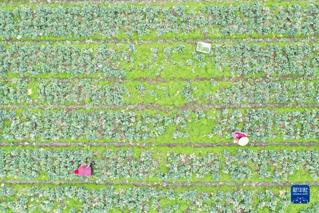 2月7日,在湖南省永州市道縣清塘鎮樓田村,村民在采摘蔬菜(無人機照片)。