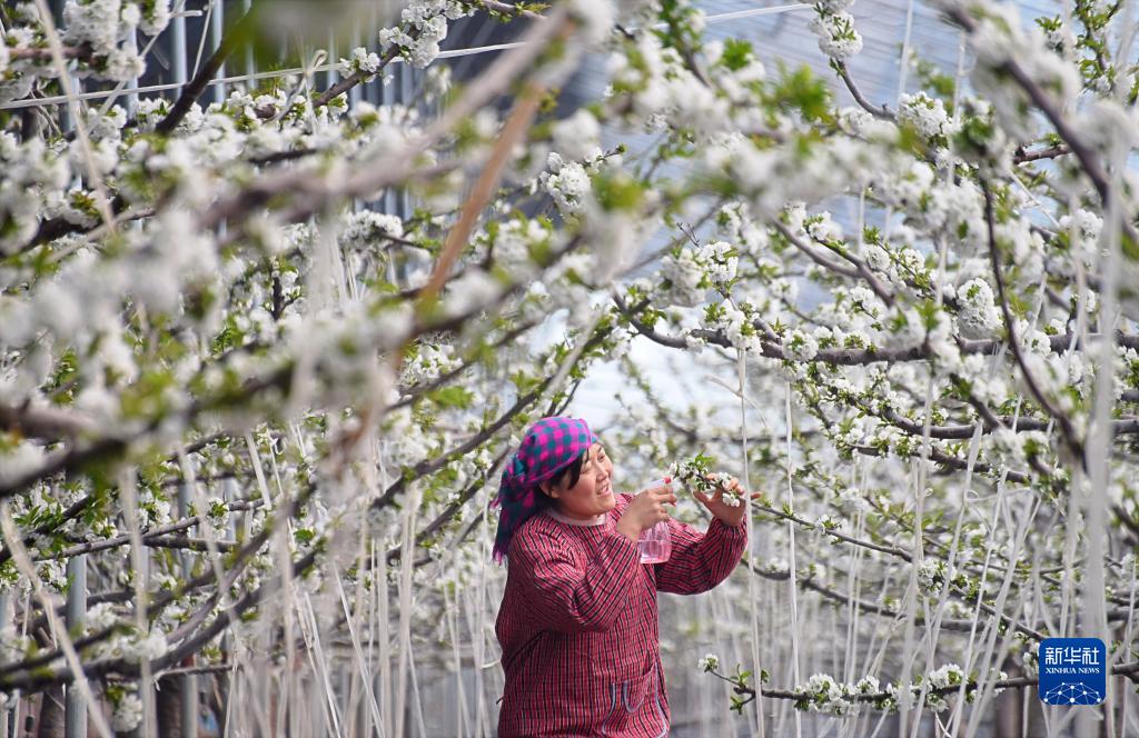 2月7日,在山東省淄博市沂源縣燕崖鎮燕崖村,果農在大棚里為大櫻桃花授粉。