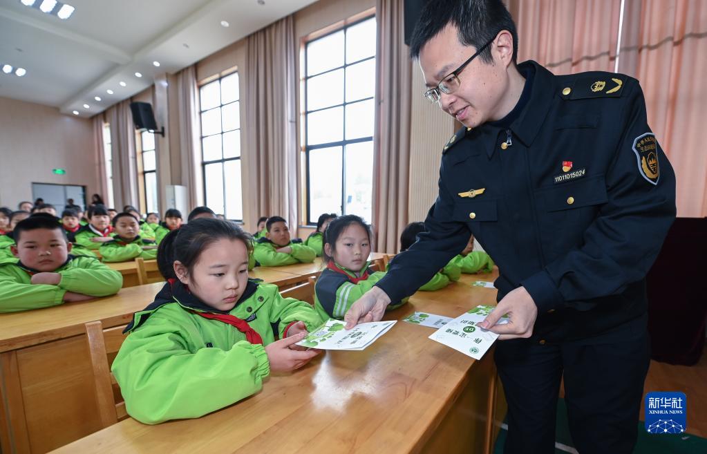 2月7日,杭州市生態環境局臨安分局的黨員志愿者在潛川小學向學生發放“無廢校園”宣傳單。