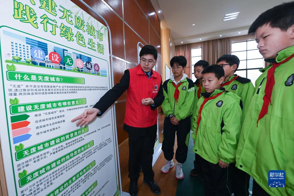 2月7日,在杭州市臨安區潛川鎮的潛川小學,杭州市生態環境局臨安分局的黨員志愿者向學生普及“無廢城市”的概念。