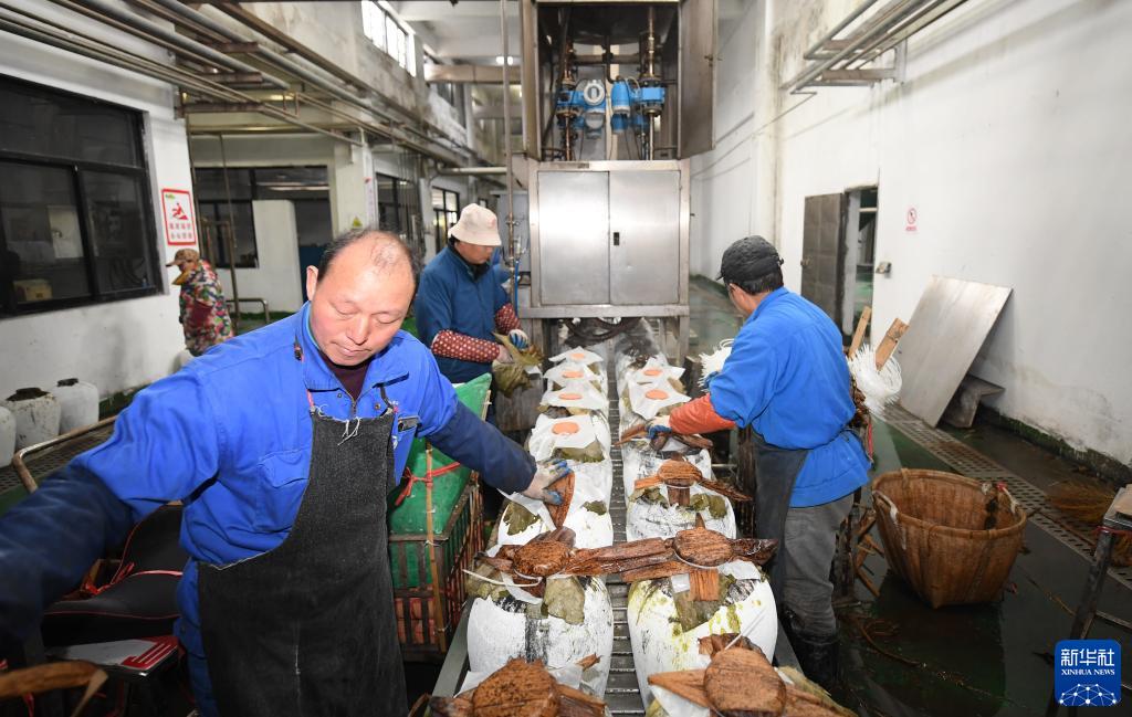 2月7日,在位于紹興市越城區的古越龍山釀酒一廠,工作人員將完成春榨的酒用傳統的荷葉、竹殼封壇。新華社記者 翁忻旸 攝