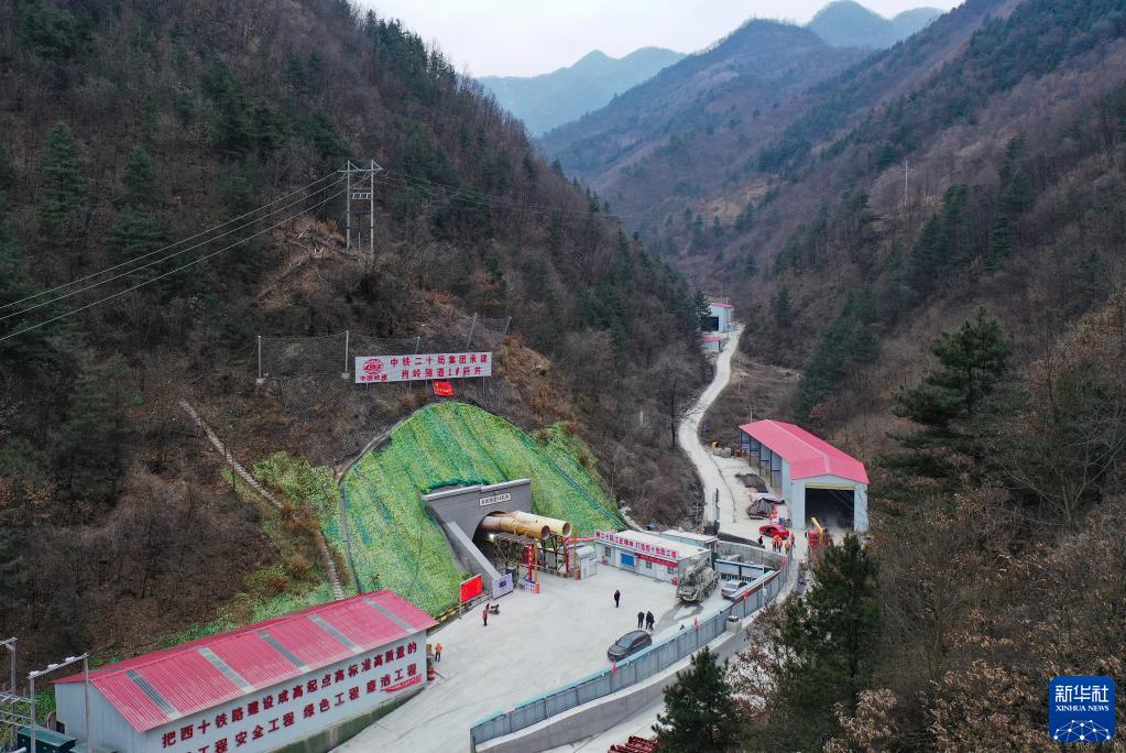 這是2月6日拍攝的位于陜西省商洛市的西十高鐵肖嶺隧道1號斜井施工現場(無人機照片)。