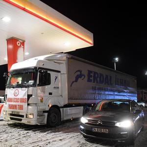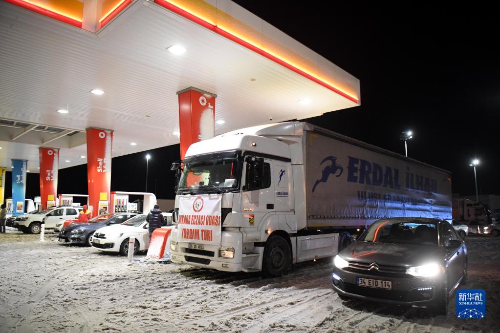 這是2月7日在土耳其伊斯坦布爾至安卡拉公路一加油站拍攝的運送救援物資的車輛。