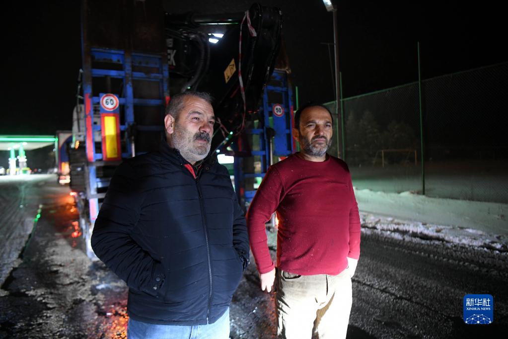 2月6日晚,在土耳其伊斯坦布爾至安卡拉公路上,貨車司機艾哈邁德·莫里斯(右)告訴記者,他駕駛重型挖土機前往災區加濟安泰普省,將參與當地救援工作。