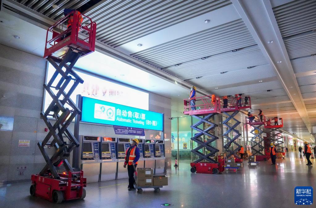 2月7日,在上海虹橋火車站,上海房建公寓段工作人員在更換站內的筒燈。