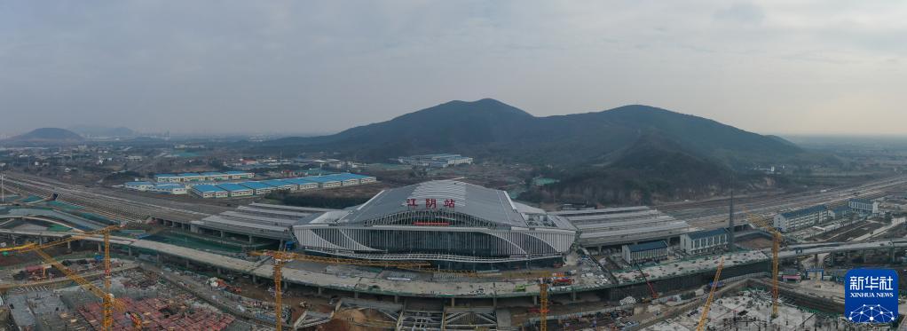 2月7日拍攝的江蘇南沿江鐵路江陰站站房(無人機照片)。
