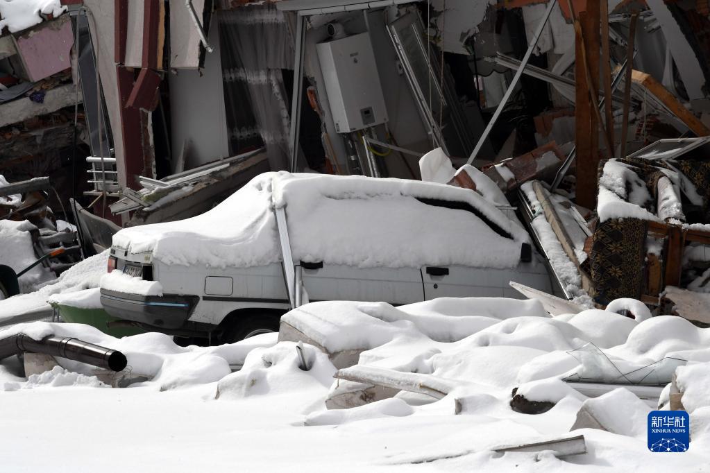 這是2月7日在土耳其卡赫拉曼馬拉什省的埃爾比斯坦地區拍攝的地震中受損的建筑物和車輛。