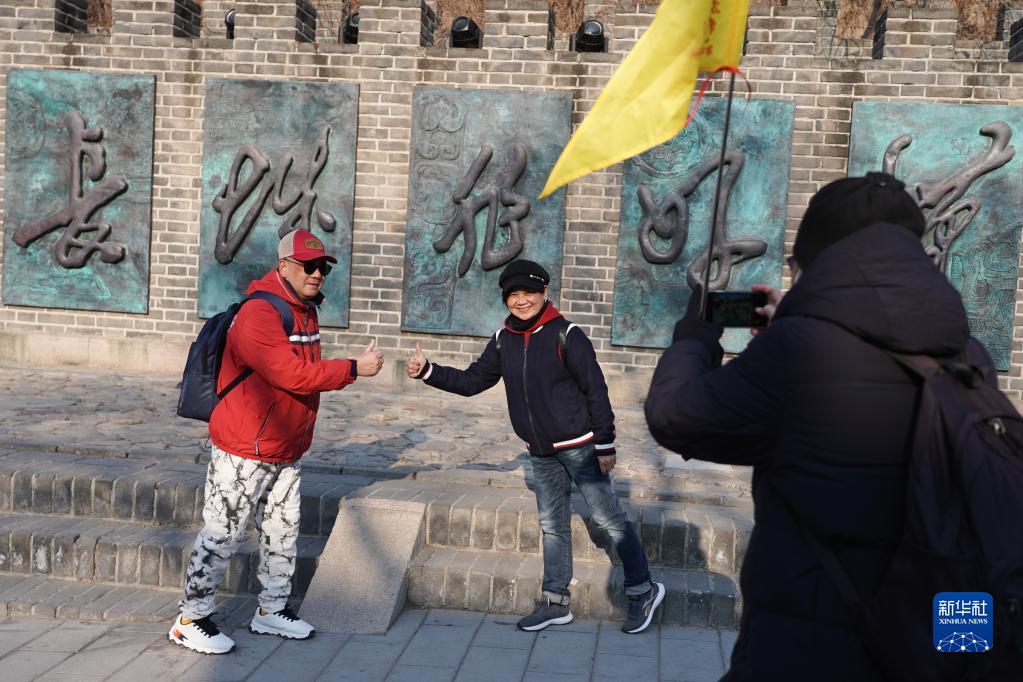 2月7日,香港游客在北京八達嶺長城“不到長城非好漢”浮雕前合影留念。