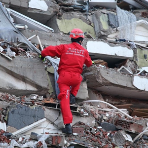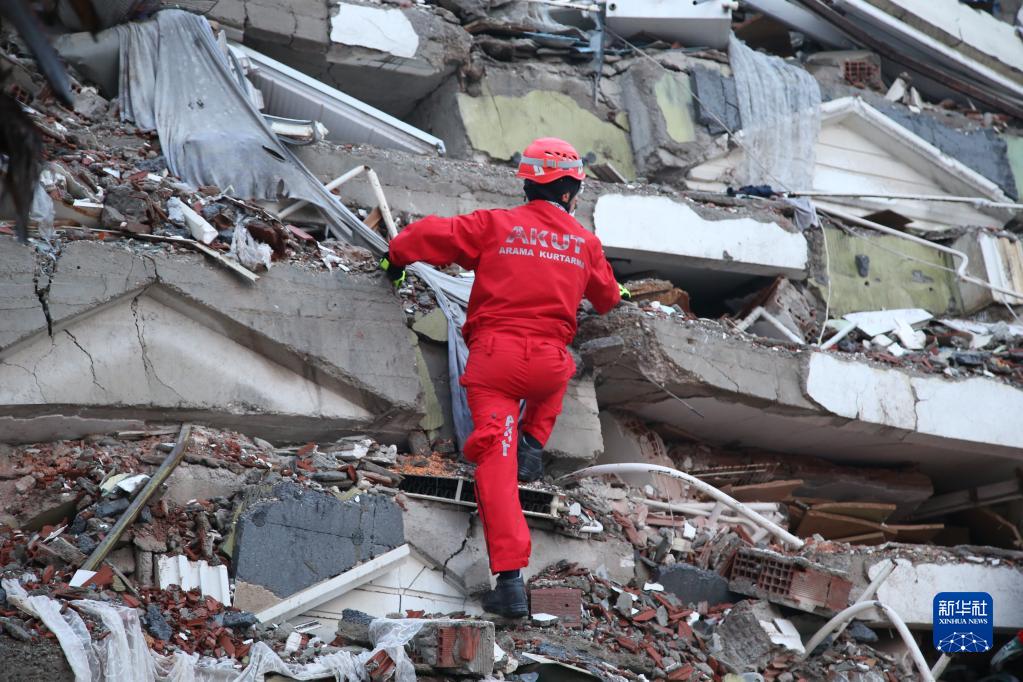 2月7日,在土耳其南部卡赫拉曼馬拉什市市中心,救援人員在搜救??ê绽R拉什市是本次地震重災區卡赫拉曼馬拉什省省會,是遭受地震破壞最為嚴重的城市之一。
