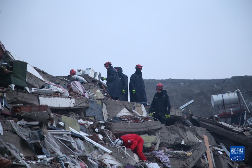 2月7日,在土耳其南部卡赫拉曼馬拉什市市中心,救援人員在搜救??ê绽R拉什市是本次地震重災區卡赫拉曼馬拉什省省會,是遭受地震破壞最為嚴重的城市之一。