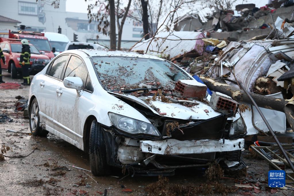 2月7日在土耳其南部卡赫拉曼馬拉什市市中心拍攝的受損的汽車??ê绽R拉什市是本次地震重災區卡赫拉曼馬拉什省省會,是遭受地震破壞最為嚴重的城市之一。