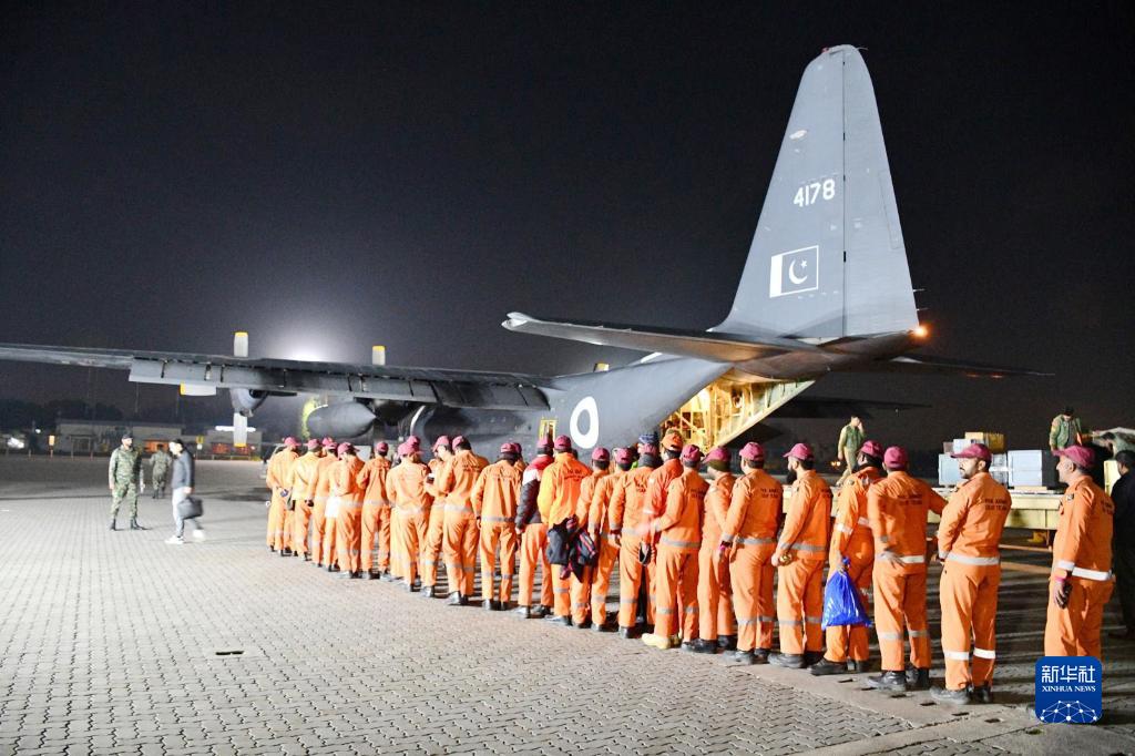 2月7日,在巴基斯坦拉瓦爾品第的努爾汗空軍基地,救援隊隊員準備飛赴土耳其。
