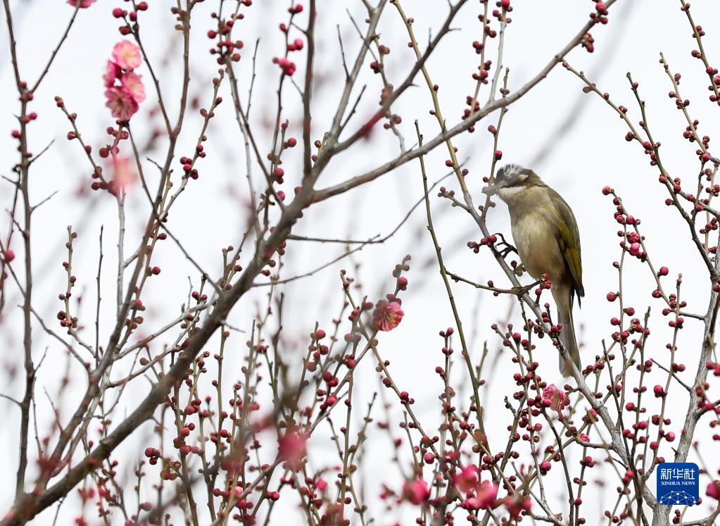 2月8日,在江蘇淮安,白頭鵯在紅梅枝頭棲息。