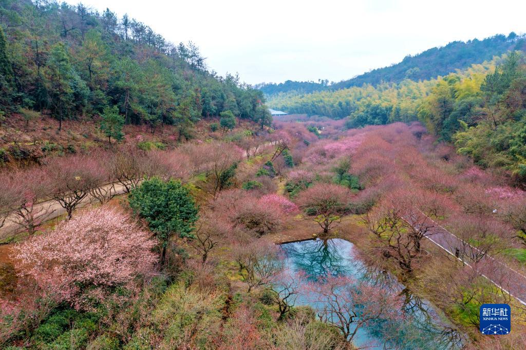 2月7日在浙江省湖州市長興縣龍山街道東方梅園拍攝的梅花(無人機照片)。