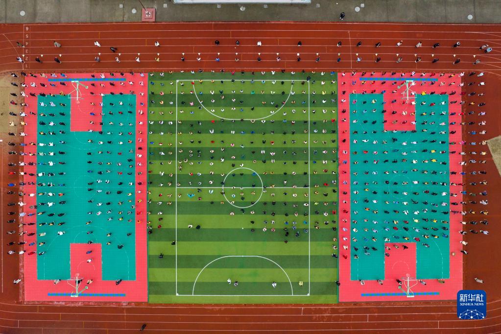 2月8日,浙江省余姚市黃家埠鎮中心小學的學生們在做體操(無人機照片)。